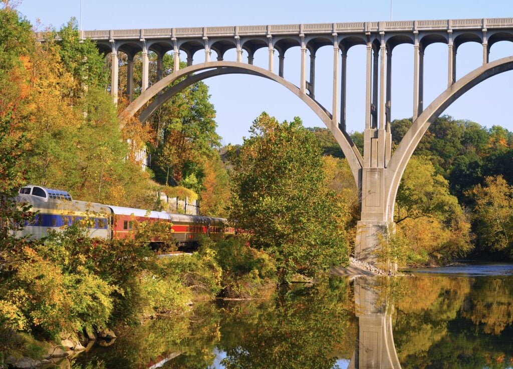 There’s a reason this Ohio favorite remains on the list: it’s one of the only scenic railways that runs directly through a U.S. National Park. The Cuyahoga Valley Scenic Railroad gives you a front-row seat to the deep forests and rolling hills of the park as they explode into fiery shades of red, orange, and purple. It’s an incredibly accessible way to experience a national park’s fall beauty.
